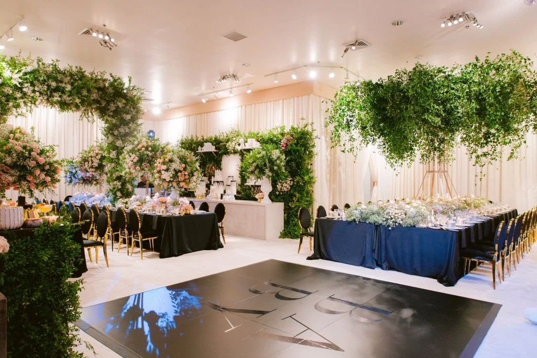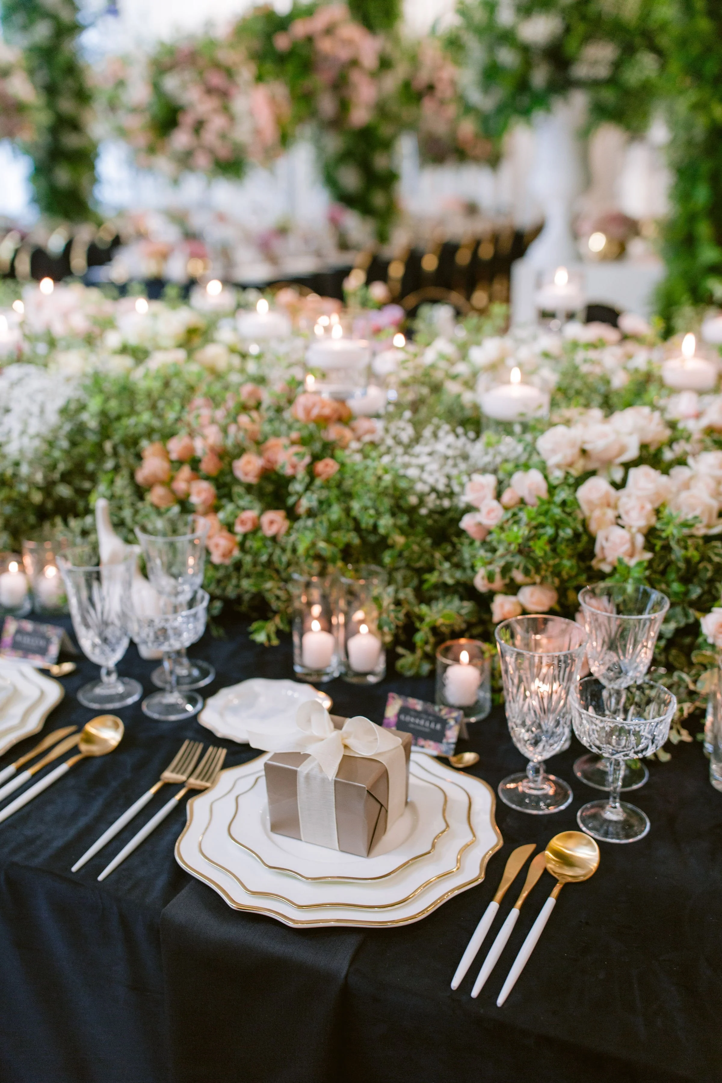 With two little boys already at home, the only person who knew Baby No. 3’d gender was Javier. He would not even share it with me! With no pink or blue to guide us, the color palette was going to be decidedly neutral, but very upscale. Many people wonder if you can use black at a baby shower, and the answer is yes! A black and white base allowed us to really focus on the texture and details of the design. To create a dreamlike space, Javier built lush, towering trees that he has become known for.
