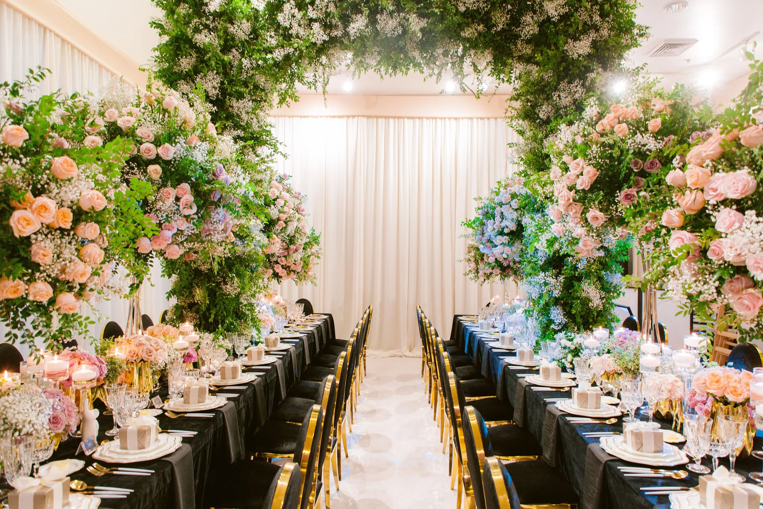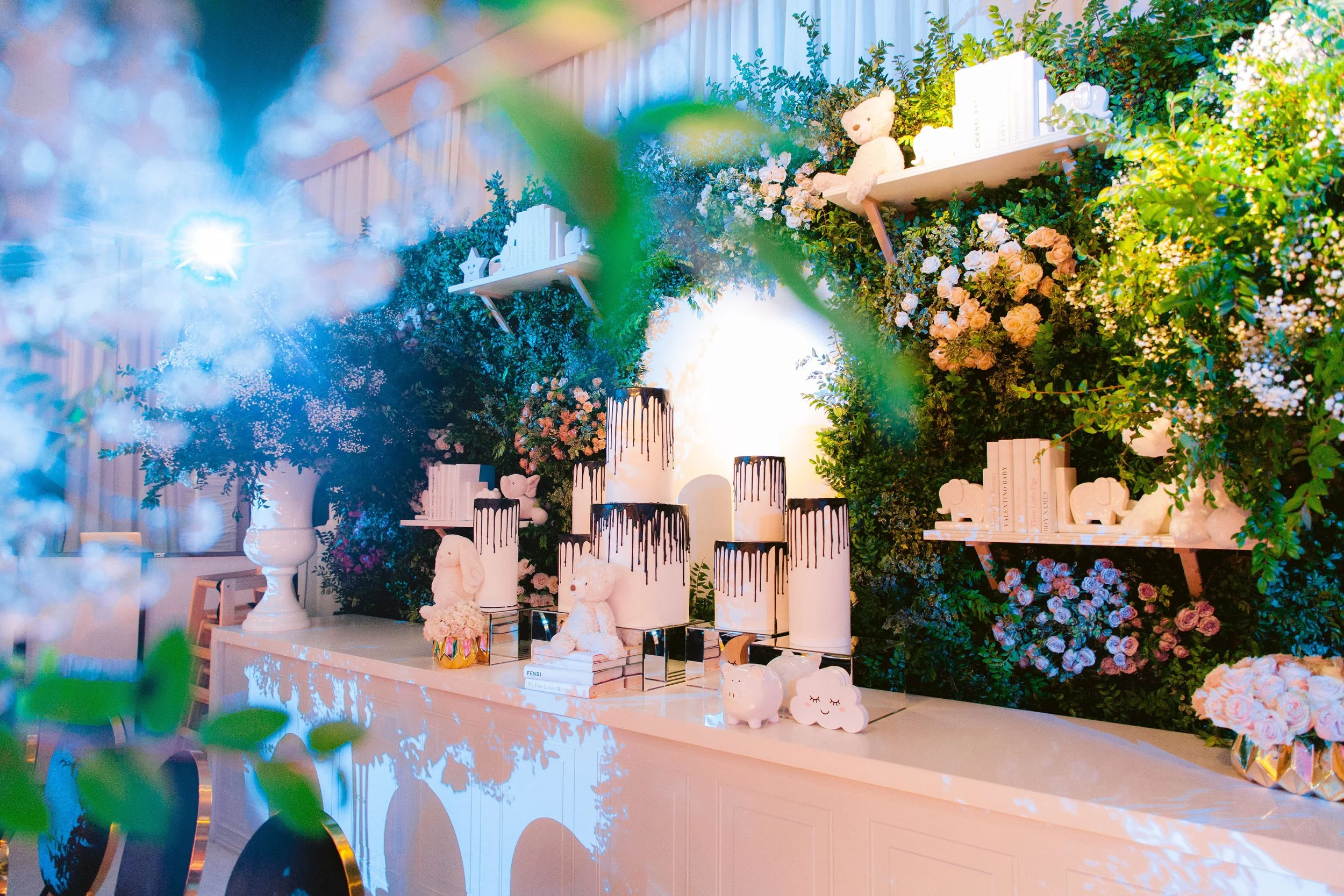 The green was carried through to create an ethereal garden atmosphere with arches of soft greens dotted with baby's breath and soft pastel florals. Generally speaking, I avoid baby’s breath. It reminds me of grocery stores and flowers bought on the side of the road pre-Valentine’s Day. But when used en masse and a major statement, or tucked into a cluster of roses, baby’s breath can add a soft texture and a beautiful element of surprise to a design. Especially for a baby shower! Baby’s breath is so sweet in real life, and the hint of it in Javier’s floral design was genius.